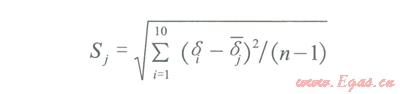 取三臺B級BK-G2.5型的皮膜式燃氣表,選擇Qmax(4.0m3/h)和0.2Qmax(0.8m3/h)兩個流量點連續(xù)測量10次得到6組測量數(shù)據(jù)(見表2),計算每組測量列的平均誤差di,然后按照貝賽爾公式可以算出每組測量列的單次實驗標準差Sj,再推算出6組實驗標準差的合并樣本標準差Sp,則有:u(v1)=Sp