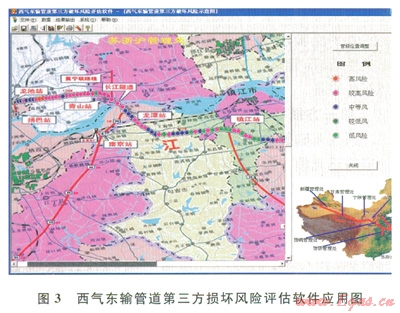 第三方損壞風險評估是評定管道沿線居民、施工單位等對管道的意外損傷或故意破壞所引起管道風險變化情況的技術。根據(jù)西氣東輸管道第三方損壞風險管理體系,利用自主開發(fā)的西氣東輸管道第三方損壞風險評估軟件(圖3)分別于2009年和2011年從沿線社會環(huán)境、居民關系、管道敷設狀態(tài)等第三方損壞的敏感因素人手開展第三方損壞風險評估工作,更新了管道附近的人口密度和工礦企業(yè)分布、管道違章占壓歷史數(shù)據(jù)和第三方施工等情況,確定了西氣東輸管道第三方損壞的風險分布。對比2009年第三方損壞風險評估結果,中等風險降低了l9.28%,較高風險增加了22.15%,揭示了管道沿線經(jīng)濟發(fā)展、人員活動增加等影響第三方損壞防控的因素正在不斷增多。