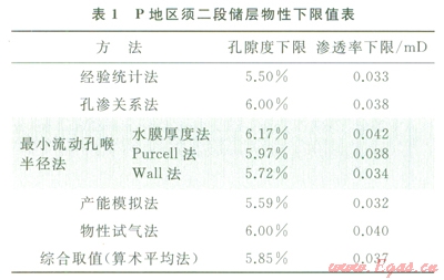 2)采用經(jīng)驗(yàn)統(tǒng)計(jì)法、孔滲關(guān)系法、最小流動孔喉半徑法(水膜厚度法、Purcell法、Wall法)、產(chǎn)能模擬法、物性試氣法等多種方法,綜合確定出川中P地區(qū)須二段低孔低滲儲層的物性下限為:孔隙度下限5.85%,滲透率下限0.037mD。通過多種方法相互驗(yàn)證,避免了因方法單一而在物性下限取值時(shí)可能產(chǎn)生的較大偏差,確定出的儲層物性下限值得到了新近試氣資料的證實(shí),為氣藏的儲量計(jì)算提供了依據(jù)。