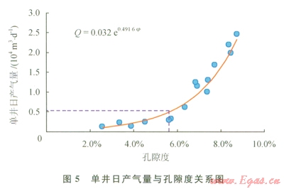 根據(jù)統(tǒng)計(jì)結(jié)果,氣層有效厚度取l5m,生產(chǎn)壓差設(shè)為5MPa,產(chǎn)能模擬實(shí)驗(yàn)結(jié)果如圖5所示??紫抖仍胶玫臍鈱?,單井日產(chǎn)量越高,兩者之間具有很好的正相關(guān)關(guān)系。當(dāng)孔隙度大于5.59%時(shí),單井日產(chǎn)量能夠達(dá)到四川地區(qū)0.5×104m3/d的最低工業(yè)氣流標(biāo)準(zhǔn)。根據(jù)孔滲關(guān)系式,得到相應(yīng)滲透率下限為0.032mD。