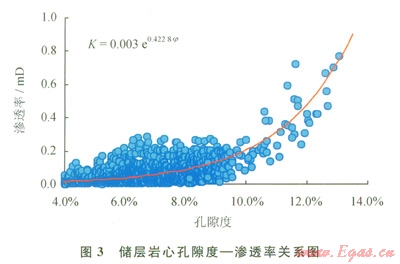 根據(jù)P地區(qū)須二段儲層巖心分析結(jié)果,做出孔隙度—滲透率交會圖(圖3)。分析發(fā)現(xiàn),巖心孔隙度低于6%時(shí),滲透率隨孔隙度增加而變化很小,此時(shí)孔隙以無效孔隙為主;巖心孔隙度大于6%時(shí),滲透率隨孔隙度增加也出現(xiàn)明顯增加,此時(shí)孔隙是具有一定滲透能力的有效孔隙。因此,以6%作為儲層與非儲層的孔隙度界限值,由孔滲關(guān)系式(式3)計(jì)算得出的滲透率為0.038mD。