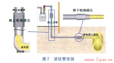 波紋管安裝方法簡單(見圖2),先在庭院靠近樓房的位置開挖一小坑,外露埋地的引入鍍鋅鋼管,將鍍鋅鋼管隔離。然后在地上引入管距地面約lm處拆開接口或引入管閥門,利用專用工具設(shè)備及按照廠家提供的操作指引,將波紋管從地上引入管開口一端推進(jìn)鍍鋅鋼管內(nèi),直至波紋管從鍍鋅鋼管另一端埋地開口導(dǎo)出。再利用特制的轉(zhuǎn)換接頭把兩端凸出的波紋管分別連接至地上金屬管和埋地聚乙烯管道,隨即進(jìn)行壓力試驗(yàn)。最后,向轉(zhuǎn)換接頭上附設(shè)的灌漿孔中注入水泥漿,填充波紋管與鍍鋅鋼管內(nèi)壁之間的空隙,至此修復(fù)工作完成。內(nèi)襯的波紋管受原來的鍍鋅鋼管保護(hù),在一定程度上可降低外力影響。室內(nèi)安裝方法與此類似。