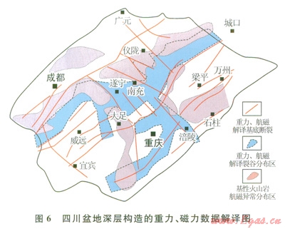 從重力、磁力處理結(jié)果的構(gòu)造解譯看,四川盆地深層構(gòu)造復(fù)雜,基底構(gòu)造形跡總體表現(xiàn)為NE向?;讛嗔岩?span lang="EN-US">NE向?yàn)橹鳎?guī)模最大的有華鎣山斷裂和龍泉山基底斷裂;川中地區(qū)發(fā)育Nw向基底斷裂,但多數(shù)受限于華鎣山斷裂和龍泉山基底斷裂之間(圖6)。通過對(duì)剩余重力異常、磁異常處理,突出深、淺部巖石磁性特征。以切割半徑為5km的2層切割剩余磁異常,向上延拓5km、10km、40km。結(jié)果表明,在綿陽、南充、大足、石柱等存在高磁異常,是盆地內(nèi)基性火山巖的響應(yīng),且緊鄰基底斷裂。對(duì)布格重力異常進(jìn)行切割半徑為5km的1層切割法,求取剩余異常與區(qū)域異常。結(jié)果表明,除大足重力高之外,剩余重力異常呈NE向緊鄰磁異常高分布。結(jié)合巖性分析,認(rèn)為結(jié)晶基底及花崗巖基底表現(xiàn)為弱異常、高重力異常;巨厚的沉積巖表現(xiàn)為弱磁異常及低重力異常;中—基性火山巖表現(xiàn)為高磁異常、中等剩余重力異常。依據(jù)上述信息,推測四川盆地深層存在裂谷盆地,總體表現(xiàn)為NE向展布,且受基底斷裂控制。裂谷兩側(cè)發(fā)育斷裂與基性火山巖伴生,可能是裂谷初期火山活動(dòng)的表現(xiàn)。根據(jù)區(qū)域資料推測,這套中一基性火山巖可能與川西—滇中裂谷充填的巨厚蘇雄組及川中女基井鉆遇的蘇雄組火山巖為同期產(chǎn)物距今時(shí)間介于803~760Ma之間。而緊鄰火山巖分布為裂谷沉積物充填,表現(xiàn)為重力低值區(qū)。需要指出,在重慶、涪陵、南充、遂寧一帶,存在受NW向斷裂控制的裂谷發(fā)育區(qū),在地震剖面上有較清楚的反射特征響應(yīng),尤其是遂寧大足之間的基底斷裂在地震反射剖面上響應(yīng)特征更為明顯。