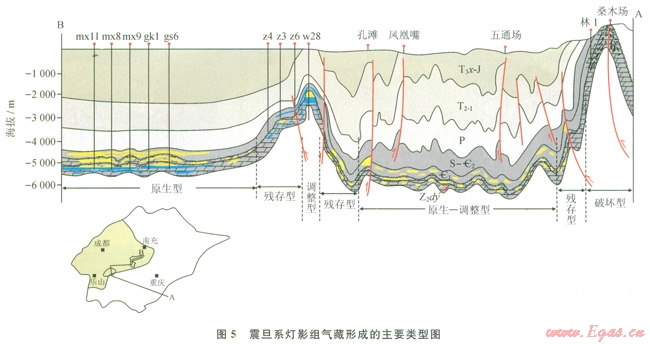 新近紀(jì)以來的喜馬拉雅運(yùn)動(dòng),對(duì)盆地深層震旦系產(chǎn)生4種變形方式:①強(qiáng)烈的褶皺沖斷作用變形,主要發(fā)生在盆地周緣,導(dǎo)致震旦系出露地表,如盆地東南緣的桑木場構(gòu)造;②強(qiáng)烈褶皺、隆升,但震旦系未遭受剝蝕,如威遠(yuǎn)地區(qū)隆升幅度較高(3000~4000m)[30];③中淺層變形強(qiáng)烈,但震旦系未卷入變形或變形微弱,如川東、蜀南地區(qū);④深層及中淺層均未卷入變形或變形微弱,如磨溪—高石梯地區(qū)。除第一變形方式對(duì)震旦系氣藏起破壞作用之外,其余的變形對(duì)震旦系氣藏調(diào)整有影響,但未被破壞?;诖?,可將喜山期震旦系氣藏可分為調(diào)整型(如威遠(yuǎn)氣田)、殘存型(如資陽地區(qū))、原生型(如磨溪 高石梯氣田)、原生—調(diào)整型(如蜀南深層)(圖5)。按此評(píng)價(jià)有利勘探區(qū)帶,磨溪—高石梯廣安一帶長期處于古今構(gòu)造疊合的高部位,是最有利勘探區(qū);有利區(qū)為遂寧—南充斜坡帶,較有利區(qū)為川東—蜀南深層。