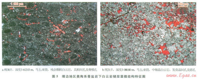 2)具有規(guī)模發(fā)育的白云巖儲集體。處于馬五6亞段膏鹽巖分布區(qū)之下的馬五7、馬五9亞段白云巖沉積時主體處于靖西臺坪沉積區(qū),多發(fā)育有利的顆粒灘相沉積,后期白云巖化可形成規(guī)模分布的白云巖晶間孔型儲集體。