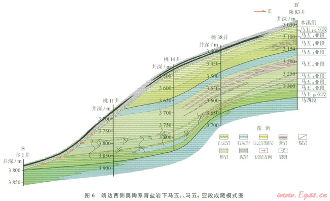 前已述及,馬五6膏鹽巖下發(fā)育馬五7、馬五9亞段及馬四段等多個儲集層段,其間又為馬五8、馬五10亞段等蒸發(fā)巖組合分隔,各自都具有相似的成藏地質(zhì)背景,因而都具有一定的成藏潛力。其次,即使在馬五8、馬五10亞段乃至馬五6亞段等蒸發(fā)巖層段中也常夾有一定儲集性的白云巖夾層,它們雖在橫向上規(guī)模相對較小,但在局部也可能形成有效的工業(yè)性聚集,對于膏鹽巖下的勘探也有一定的實際意義。