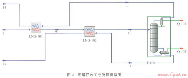 甲醇回收流程中的各點(diǎn)操作參數(shù):甲醇污水(物流8,溫度-l5℃、壓力250kPa、流量507kg/h、含醇量為35%)通過(guò)換熱器(LNG-l01)、(LNG-102)分別與產(chǎn)品甲醇(物流l2)、塔底水(物流ll)換熱,溫度升為75℃后進(jìn)精餾塔(T-100),塔底污水(11)和產(chǎn)品甲醇(12)返回?fù)Q熱器回收熱量后回注地層和循環(huán)使用。