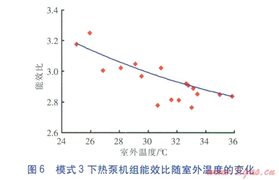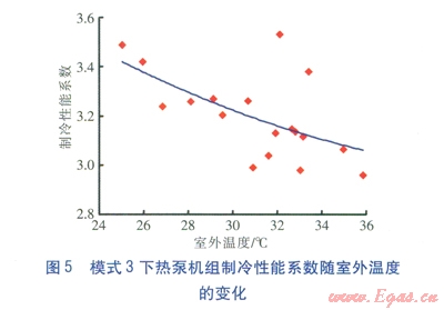 對(duì)于模式l,熱泵機(jī)組的制冷性能系數(shù)、能效比不高,且隨著室外溫度升高下降速率較快。對(duì)于模式2,熱泵機(jī)組的制冷性能系數(shù)、能效比較高,但隨著運(yùn)行時(shí)間的延長(zhǎng)下降速率較快。對(duì)于模式3,熱泵機(jī)組的制冷性能系數(shù)、能效比水平處于模式1與模式2之間,但隨著室外溫度的升高下降趨勢(shì)不明顯。因此,風(fēng)冷—水冷冷凝器聯(lián)合運(yùn)行,對(duì)熱泵機(jī)組在長(zhǎng)時(shí)間運(yùn)行過(guò)程中保持較高性能有幫助。而且可平衡地埋管換熱器向土壤的釋熱、吸熱量,保持熱泵系統(tǒng)長(zhǎng)期有效運(yùn)行。