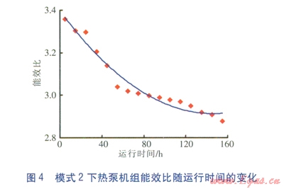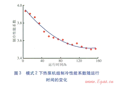 模式2下熱泵機(jī)組制冷性能系數(shù)隨運(yùn)行時(shí)間的變化見(jiàn)圖3,圖中紅色點(diǎn)為實(shí)測(cè)數(shù)據(jù)點(diǎn),平滑曲線為擬合曲線:ICOP=2×10-5t2-0.0065t+3.981,t為運(yùn)行時(shí)間(單位為h)。由圖3可知,模式2下,雖然熱泵機(jī)組制冷性能系數(shù)隨運(yùn)行時(shí)間的延長(zhǎng)呈下降趨勢(shì),且下降速率較快,但有趨于平穩(wěn)的趨勢(shì)。模式2下熱泵機(jī)組能效比隨運(yùn)行時(shí)間的變化見(jiàn)圖4,圖中紅色點(diǎn)為實(shí)測(cè)數(shù)據(jù)點(diǎn),平滑曲線為擬合曲線:IEER=2×10-5t2-0.0066t+3.3975。由圖3、4可知,模式2下熱泵機(jī)組能效比與制冷性能系數(shù)的變化趨勢(shì)基本一致。