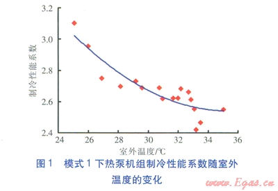 采用試驗(yàn)方法,針對(duì)夏季工況,測(cè)試計(jì)算3種運(yùn)行模式下熱泵機(jī)組的制冷性能系數(shù)、能效比,并進(jìn)行比較。