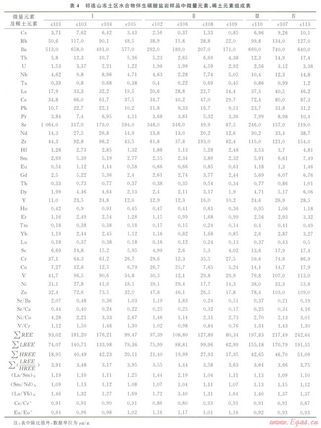 野外鉆探取樣過程中發(fā)現(xiàn)水合物常與碳酸鹽巖伴生,這一現(xiàn)象暗示了水合物可能與碳酸鹽巖之間存在著某種聯(lián)系。海底水合物分布區(qū)中伴生碳酸鹽巖中的碳普遍認(rèn)為主要來源于水合物分解釋放的甲烷,其次還可能來源于滲漏的甲烷氣體,或深部滲漏的重?zé)N(油)、沉積物中有機(jī)質(zhì)等被氧化產(chǎn)物。對(duì)祁連山凍土區(qū)伴生碳酸鹽巖中C、O同位素研究表明,第Ⅰ、Ⅲ、Ⅳ類伴生碳酸鹽巖巾碳、氧同位素組成相關(guān),而第Ⅱ類伴生碳酸鹽巖中碳、氧同位素組成相對(duì)獨(dú)立,第Ⅱ類伴生碳酸鹽巖組成明顯不同于第Ⅰ、Ⅲ、Ⅳ類伴生碳酸鹽巖[31],其伴生碳酸鹽巖礦物如方解石、文石、白云石中13C較大程度虧損指示著甲烷是其碳酸鹽巖的一個(gè)主要碳源[32-33]。顯微鏡下觀察發(fā)現(xiàn),第Ⅱ類碳酸鹽巖中產(chǎn)出較多草莓狀黃鐵礦,這些特征表明有微生物參與沉積成巖,這也造成第Ⅱ類碳酸鹽巖元素地球化學(xué)特征有別于其他類型碳酸鹽巖。