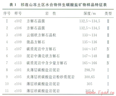樣品采自青海祁連山木里凍土區(qū)水合物科學(xué)試驗(yàn)鉆探井不同深度巖心,共11件,其均產(chǎn)自水合物產(chǎn)出層段內(nèi)[24],樣品采集深度及地質(zhì)特征見表1。樣品本身為碳酸鹽巖、碳質(zhì)泥巖、泥巖等,其內(nèi)均含碳酸鹽礦物。按地質(zhì)產(chǎn)狀的不同,伴生碳酸鹽礦物在巖層中的賦存狀態(tài)可分成以下4種類型:①白色薄層狀碳酸鹽巖(3~5cm厚),產(chǎn)出在水合物分布層段泥巖中(Ⅰ型,圖2-a);②煙灰色菱形晶簇狀方解石集合體,產(chǎn)出在水合物附近,或呈(云煙狀)微晶方解石(Ⅱ型,圖2-b);③深灰色薄殼狀碳酸鹽巖(小于lmm),產(chǎn)出在水合物層段內(nèi)泥巖微裂隙中(Ⅲ型,圖2-c);④微細(xì)浸染狀方解石或微量的碳酸鹽巖,賦存于碳質(zhì)泥巖等中(Ⅳ型,圖2-d)。樣品經(jīng)顯微鏡觀察和X射線粉晶衍射分析,伴生碳酸鹽巖主要由石英、白云石、云母、斜長石、綠泥石、方解石和文石組成,如表2所示。