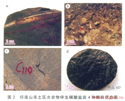 實(shí)際中,祁連山凍土區(qū)與水合物伴生的第Ⅰ、Ⅲ、Ⅳ類碳酸鹽巖在鉆孔中產(chǎn)出深度在144~305m,主要屬江倉組,為l套淺湖—半深湖環(huán)境的細(xì)碎屑泥巖、粉砂巖等。其中,第Ⅰ類碳酸鹽巖旱白色薄層狀?yuàn)A層產(chǎn)出在泥巖層中,厚度介于3~5cm(圖2-a),第Ⅲ類碳酸鹽巖呈深灰色薄殼狀產(chǎn)出在泥巖微裂隙中,厚度一般小于1mm(圖2-c),第Ⅳ類碳酸鹽巖呈微細(xì)浸染狀賦存于炭質(zhì)(鈣質(zhì))泥巖等中(圖2-d),該類碳酸鹽巖所在巖層新鮮面上肉眼可見白色絲狀非晶質(zhì),點(diǎn)滴鹽酸時(shí)出現(xiàn)強(qiáng)烈冒泡現(xiàn)象。