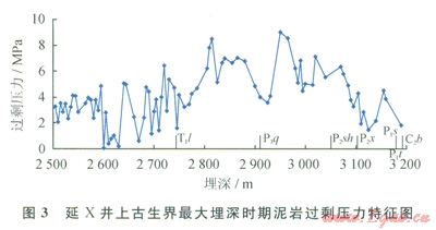 一般來說浮力和水動(dòng)力是油氣二次運(yùn)移的主要?jiǎng)恿?,在常?guī)油氣二次運(yùn)移過程中浮力和水動(dòng)力作用較強(qiáng)。但在鄂爾多斯盆地上古生界由于儲(chǔ)層成巖早期壓實(shí)作用和膠結(jié)作用強(qiáng)烈,因而在造成儲(chǔ)層致密化的同時(shí),也導(dǎo)致儲(chǔ)層中的自由水大為減少,從而難以產(chǎn)生較強(qiáng)的浮力和水動(dòng)力[28]。另一方面,流體南高勢(shì)區(qū)向低勢(shì)區(qū)運(yùn)移的原理只適用于連通的水力系統(tǒng),而不適用于多個(gè)封隔體之間。泥巖壓實(shí)研究表明,盆地上古生界地層在三疊紀(jì)末 白堊紀(jì)發(fā)育“非均衡壓實(shí)” [16-17,21,24,26],該區(qū)最大埋深時(shí)期(白堊紀(jì))泥巖過剩壓力幅度介于0~10MPa,過剩壓力峰值出現(xiàn)在三疊系劉家溝組—上石盒子組(圖3),在壓力封存箱的上下、側(cè)向高壓泥巖阻隔之間,很難出現(xiàn)區(qū)域運(yùn)移??梢?,鄂爾多斯盆地上古生界缺乏天然氣大規(guī)模、長距離運(yùn)移的動(dòng)力條件。