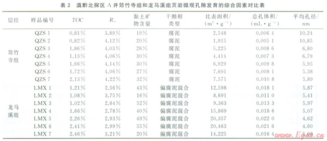 泥貝巖微觀孔隙的發(fā)育演化,不是受單一的條件控制,而是巖性、礦物組合、溫壓等多方面因素影響的綜合體[5,26]。有機(jī)碳含量、干酪根類型、黏土礦物與含量、熱演化程度等因素,均不同程度地控制著泥頁巖微觀孔隙的發(fā)育[26]。通過荇類分析化驗(yàn)的對比研究發(fā)現(xiàn),滇黔北高演化區(qū)筇竹寺組泥頁巖微觀孔隙的發(fā)育演化也與上述因素有著密切的關(guān)系。