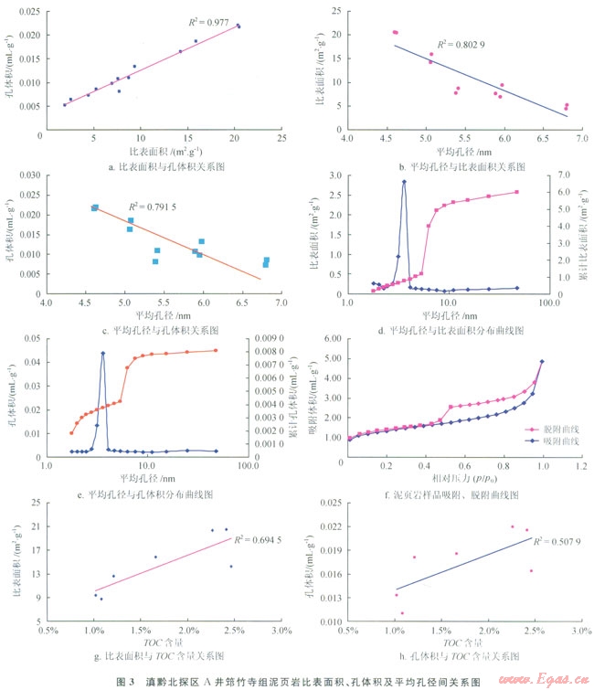 對滇黔北A井筇竹寺組泥頁巖樣品進(jìn)行了比表面積測量和孔徑在1.5~300.0nm樣品的孔體積測試,得出筇竹寺組頁巖氣儲層的比表面積為1.915~7.691m2/g.平均為5.185m2/g;孔體積為0.0051~0.0108mL/g,平均為0.0080mL/g;平均孔徑為5.38~10.85nm。反映筇竹寺組泥頁巖的比表面積和孔體積均較大。有利于頁巖氣的吸附。從中也可以看出,其孔比表而積與孔體積二者之間具有較好的正相關(guān)性,即隨著比表面積的增大??左w積也隨之增大(圖3-a、3-b)。與之相反。比表面積、孔體積與平均孔徑則呈負(fù)相關(guān)性。即比表面積、孔體積均隨孔徑的增大而減小(圖3-c、3-d).且當(dāng)孔徑小于10nm時,孔體積分布曲線很陡,而當(dāng)孔徑大于等于10nm時,曲線則逐漸變得平緩,說明孔徑范圍在1~8nm內(nèi)的孔隙對泥頁巖比表而積、孔體積值的貢獻(xiàn)最大(圖3-c),即小孔隙越發(fā)育,頁巖的比表面積、孔體積越大,越有利于泥頁巖對頁巖氣的吸附聚集。