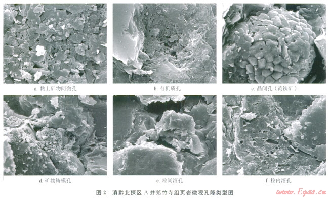 根據(jù)IUPAC的劃分方案[24-25],按孔隙大小可將滇黔北地區(qū)筇竹寺組泥頁巖微觀孔隙,劃分為微孔(小于l0nm)、小孔(10~100nm)、中孔(100~1000nm)和大孔(大于l000nm) [26];按成因,可將基質(zhì)孔隙區(qū)分為礦物間微孔、有機(jī)質(zhì)孔、晶間孔、礦物鑄???、次生溶蝕孔等(圖2),這類孔隙分別代表了不同成因類型及不同大小。在所有微觀孔隙中,微孔隙對頁巖氣儲集空間的貢獻(xiàn)最大,而小孔和大孔。則分別可能為泥頁巖毛細(xì)凝結(jié)、擴(kuò)散和滲流、層流的主要區(qū)域[26]。