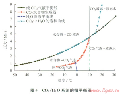 對(duì)管道安全運(yùn)行影響最大的雜質(zhì)就是水。從大多數(shù)源頭捕獲的CO2混合氣體都含有一定量的水。實(shí)際含水量隨氣體來(lái)源不同而變化。例如,利用氨吸收法從煙道氣中捕集的CO2中含水量的體積分?jǐn)?shù)通常超過(guò)5%。絕大部分的水在壓縮及脫水階段(常采用三甘醇)被脫除。而來(lái)自于煤氣化工藝的CO2通過(guò)低溫甲醇洗分離工藝,只含有0.0002%的水。