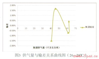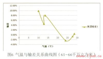 (3)在現(xiàn)有數(shù)據(jù)基礎(chǔ)上,暫未發(fā)現(xiàn)供氣量與輸差之間的明顯函數(shù)關(guān)系。但是,從圖8觀察發(fā)現(xiàn),輸差曲線1、2、3(修正)對(duì)應(yīng)的供氣量依次為:41—45、56—60、61—66,單位千萬(wàn)立方米。隨著供氣量的大幅上升,輸差曲線呈向左下方平移的趨勢(shì)。即溫度等其他條件一定的情況下,隨著供氣量的大幅增加,輸差有減小的趨勢(shì)。初步分析,可能是由規(guī)模效應(yīng)導(dǎo)致。此推斷是否成立有待進(jìn)一步的研究,可做為下一研究課題。