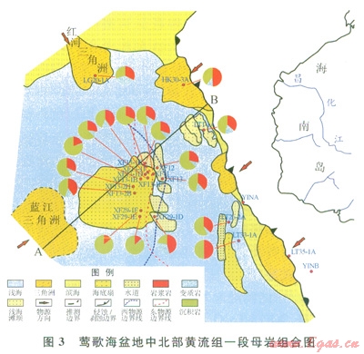 圖l顯示鶯歌海盆地圍區(qū)發(fā)育多條河流,西北部的紅河,總流域面積達(dá)ll.9×104km2,年輸沙量為1300×104t[6];海南島西部為昌化江,總長(zhǎng)度約為250km,河水含沙量為0.392kg/m3[7],小于黃河而大于長(zhǎng)江;此外,海南島的西部尚有多條獨(dú)流入海的河流。越南東部也有馬江、藍(lán)江、宋河、賢良河等河流,性質(zhì)與海南島類似。