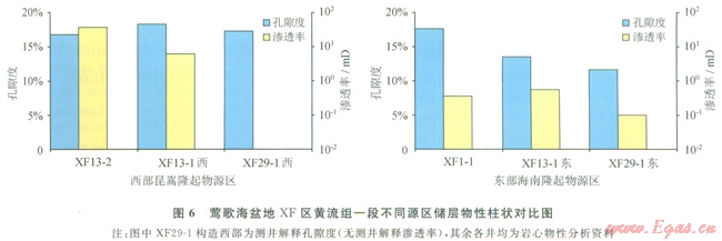 圖6也展示了由于物源區(qū)的不同造成儲(chǔ)集物性的差異。源于昆嵩隆起物源區(qū)的XFl3-2氣田、XFl3-1氣田西部、XF29-1構(gòu)造西部,巖心物性分析的孔隙度平均為16.8%~l8.3%,滲透率介于6.2~37.4mD,屬低、中滲型中等至好儲(chǔ)集層。而以海南隆起物源區(qū)為主的XFl-1氣田、XFl3-1氣田東部、XF29-1構(gòu)造東部諸井的儲(chǔ)層巖心孔隙度平均值為ll.7%~l7.6%、滲透率為0.1~0.5mD,屬低—特低滲型差儲(chǔ)集層或致密層,儲(chǔ)層質(zhì)量明顯劣于西部物源區(qū)。