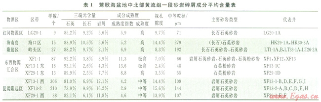 表1顯示,盆地中北部黃流組一段時(shí)期總體上以石英砂巖類為主,但不同區(qū)帶的長(zhǎng)石、巖屑含量有差異。鶯東斜坡海口區(qū)、嶺頭區(qū)長(zhǎng)石平均含量介于9.7%~10.5%,巖屑平均含量介于2.8%~5.8%,以長(zhǎng)石石英砂巖為主,反映以花崗巖為主的海南隆起區(qū)物源性質(zhì);西北部的LG20-1構(gòu)造,其石英、長(zhǎng)石、巖屑含量與鶯東斜坡??凇X頭區(qū)相近,仍以長(zhǎng)石石英砂巖為主,但其粒度偏細(xì)(平均粒度中值為71mm),為極細(xì)砂,反映離物源區(qū)較遠(yuǎn),從其地理位置來(lái)看應(yīng)屬紅河物源體系;XFl3-2氣田、XFl3-1氣田西部、XF29-1構(gòu)造西部則以巖屑石英砂巖較為多見(jiàn),巖屑平均含量介于11.8%~l6.2%(主要為片巖、千枚巖、變質(zhì)砂巖),中等成分成熟度,反映西部昆嵩隆起區(qū)含較多變質(zhì)巖類物源特征;而XFl、XFl2、XFl3、XFl3-1C、XF29-1D井砂巖,粒度細(xì)(粒度中值介于48~66mm),長(zhǎng)石、巖屑含量低,平均含量分別為2.5%~3.8%、3.9%~7.7%,石英含量極高(大于90%),多為石英粉砂巖,成熟度指數(shù)介于8.8~13.6,屬高極高成分成熟度,反映這些井區(qū)沉積物經(jīng)過(guò)較長(zhǎng)距離的搬運(yùn)。