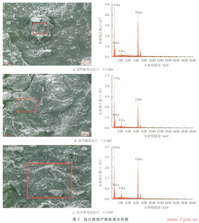 2)通過(guò)掃描電鏡觀察,發(fā)現(xiàn)腐蝕掛片表面形成片狀腐蝕產(chǎn)物;能譜顯示腐蝕產(chǎn)物主要含Fe、O元素和少量S元素。分析其腐蝕機(jī)理,腐蝕產(chǎn)物主要呵能是FeOOH、FeSO4、Fe2O3和Fe3O4。