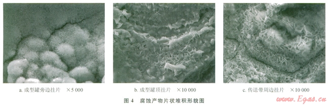有3處試片表面堆積的腐蝕產(chǎn)物膜較厚;能譜分析顯示腐蝕產(chǎn)物主要為氧、鐵、硫3種元素,以鐵、氧元素為主,硫元素含量較少。將腐蝕產(chǎn)物迸一步放大觀察可得,腐蝕產(chǎn)物均呈片狀堆積(圖4)。結(jié)合腐蝕環(huán)境和腐蝕產(chǎn)物成分、形貌,可以推斷片狀腐蝕產(chǎn)物可能是FeOOH[10-13]。