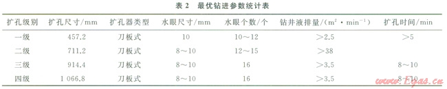 3)加大鉆井液排量,改進(jìn)水眼配置,提高水眼射速。擴(kuò)孔水力參數(shù)對(duì)比情況見(jiàn)表1。