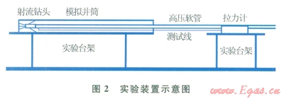 實(shí)驗(yàn)裝置示意圖如圖3所示。模擬井筒水平放置,固定于實(shí)驗(yàn)臺(tái)架上。實(shí)驗(yàn)臺(tái)架固定于地面上,保證實(shí)驗(yàn)時(shí)模擬井筒不發(fā)生移動(dòng)或轉(zhuǎn)動(dòng)。連接高壓軟管的多孔射流鉆頭放置于模擬井簡(jiǎn)內(nèi),將拉力測(cè)試線一端連接于多孔射流鉆頭后端接頭,另一端連接于拉力計(jì)上。拉力計(jì)固定于另一實(shí)驗(yàn)臺(tái)架上,2個(gè)實(shí)驗(yàn)臺(tái)架高度相同,以確保拉力測(cè)試線水平。實(shí)驗(yàn)時(shí),2個(gè)實(shí)驗(yàn)臺(tái)架均固定在地面上,通過拉力測(cè)試線長(zhǎng)度來確定射流鉆頭的正向噴距。經(jīng)實(shí)驗(yàn)測(cè)量,當(dāng)柴油機(jī)的轉(zhuǎn)數(shù)相同時(shí),無論連接哪種射流鉆頭,高壓泵的排量大小都相差不大。因此在實(shí)驗(yàn)中,通過固定柴油機(jī)轉(zhuǎn)數(shù)的方法來保證應(yīng)用不同射流鉆頭時(shí)流量相同。