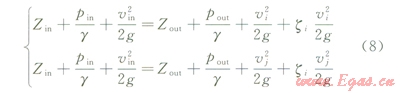 以圖l中E點(diǎn)為例,在反向射流作用下,E點(diǎn)流體由于被卷吸而產(chǎn)生低壓效應(yīng),由于高速射流卷吸作用,E點(diǎn)流體流速可近似等于反向射流速度(vj),對(duì)E點(diǎn)應(yīng)用伯努利方程計(jì)算其流體壓強(qiáng),可得: