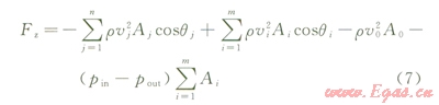 由于所選控制體關(guān)于x軸的對(duì)稱,其在y軸方向的動(dòng)量變化可以相互抵消,故只需分析控制體內(nèi)z軸方向的動(dòng)量變化和受力情況,故將式(1)投影于x軸可得: