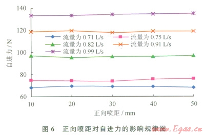 噴距是高壓水射流技術(shù)中的一個(gè)重要參數(shù),正向噴距是指射流鉆頭前端面與井底之間的距離。如圖6所示,在實(shí)驗(yàn)條件下,選取正反流量比為2/3的射流鉆頭作為研究對(duì)象,井筒直徑選取49mm,隨著正向噴距的增大,在同一流量下射流鉆頭產(chǎn)生的自進(jìn)力變化不大,基本持平。以流量為0.91L/s時(shí)為例,噴距為10mm時(shí),自進(jìn)力為ll8.7N;噴距為20mm時(shí),自進(jìn)力為ll9.6N;噴距為30mm時(shí),自進(jìn)力為ll7.8N;噴距為40mm時(shí),白進(jìn)力為ll8.9N;噴距為50mm時(shí),自進(jìn)力為ll9.1N。這主要是因?yàn)樯淞魉a(chǎn)生的反沖力大小僅與噴嘴出口處流速有關(guān),與接觸靶物時(shí)的速度無關(guān),故反沖力大小與正向噴距無關(guān),同時(shí)井筒直徑大小不變,改變正向噴距并不影響反向射流的降壓效應(yīng),所以正向噴距對(duì)自進(jìn)力的影響不大。在實(shí)驗(yàn)條件下,井筒直徑為49mm,排量范圍為0.71~0.99L/s,噴距從10mm增加到50mm時(shí),正反流量比為2/3的射流鉆頭所產(chǎn)生的白進(jìn)力范圍為67.8~135.2N。