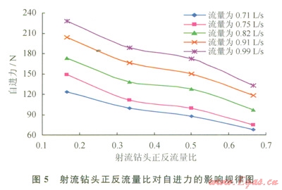 當(dāng)流量不變時(shí),射流鉆頭的正反流量比對(duì)自進(jìn)力的影響就顯得比較重要。通過實(shí)驗(yàn)測(cè)量發(fā)現(xiàn),射流鉆頭所產(chǎn)生的自進(jìn)力隨著正反流量比的增大而減小,近似呈線性關(guān)系變化(圖5)。以噴距為10mm,井筒直徑為49mm,流量為0.99L/s時(shí)為例,正反流量比為2/3的射流鉆頭所產(chǎn)生的自進(jìn)力為133.2N;正反流量比為l/2的射流鉆頭所產(chǎn)生的自進(jìn)力為171.9N;正反流量比為l/3的射流鉆頭所產(chǎn)生的牽引力為188.5N;正反流量比為l/6的射流鉆頭產(chǎn)生所產(chǎn)生的牽引力為228.1N。這是因?yàn)殡S著正反流量比的減小,反向射流的流量分配比例增大,反向射流所產(chǎn)生的反推力也增大,同時(shí)反向射流的降壓效應(yīng)也越明顯,故可以產(chǎn)生更大的自進(jìn)力。在實(shí)驗(yàn)條件下,射流鉆頭流量比從1/6增大到1/3,排量在0.71~0.99L/s時(shí)范圍,所產(chǎn)生的自進(jìn)力范圍為67.8~228.1N。
