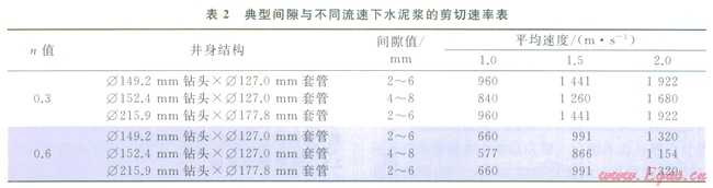 計算水泥漿流變參數(shù)通常使用旋轉黏度計f300與f100的讀值,其主要考慮到水泥漿在一般環(huán)空中的剪切速率在511s-l與l70s-1之間。但在小間隙環(huán)空中,水泥漿處于高剪切狀態(tài),剪切速率一般大于500s-1,表2給出了典型的環(huán)空間隙與不同流速下的水泥漿剪切速率值的比較情況。