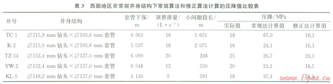 建立的小間隙注水泥環(huán)空流動計算模型在西部地區(qū)多口非常規(guī)井的注水泥平衡壓力設計計算中加以了應用?,F(xiàn)場應用結果表明:小間隙注水泥環(huán)空流動計算模型計算出的壓力值接近實際施工壓力值。表3為西部地區(qū)非常規(guī)井身結構下采用常規(guī)算法和小間隙環(huán)空流動計算修正方法計算的壓降值和施工實際壓力值的比較情況。