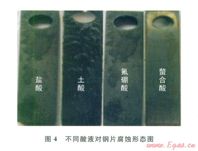 從圖4中可以看出,螯合酸腐蝕不是很明顯,表面附著少許薄膜,且表面光鮮明亮,而其他3種無機(jī)酸液對(duì)鋼片腐蝕嚴(yán)重,表面有黑色的物質(zhì),同時(shí)具有明顯的腐蝕溝槽。