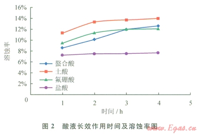 實(shí)驗(yàn)設(shè)計(jì)了4種酸液與某油氣田沙河街組儲(chǔ)層的巖粉反應(yīng),對(duì)比在1h、2h、3h、4h酸液對(duì)巖粉的溶蝕率,以及最終的溶蝕率,研究螯合酸液體系的緩速性能。實(shí)驗(yàn)溫度l30℃,實(shí)驗(yàn)4種酸液分別為:10%HCl、10Y00 HCl+2%HF、10%HCl+8%HBF4、l0%螯合酸。實(shí)驗(yàn)結(jié)果表明(圖2):鹽酸與巖粉反應(yīng)速率最快,溶蝕率最低,土酸與巖粉反應(yīng)溶蝕率最高,在2h反應(yīng)基本完成,氟硼酸溶蝕率比螯合酸略低;鹽酸溶蝕率基本保持在7.5%,土酸溶蝕率在2h變化較大,之后基本無很大變化,溶蝕率最高達(dá)l3.9%,螯合酸表現(xiàn)出明顯的緩速性能,隨著反應(yīng)時(shí)間延長(zhǎng),螯合酸溶蝕率逐漸升高,最高達(dá)l2.6%。