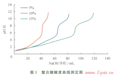 鈣、鎂、鋁離子螯合能力測(cè)試方法為取10mL螯合酸于蒸餾水中,稀釋到250mL并置于250mL容量瓶中,加入5%NaOH調(diào)節(jié)pH值為l0~11,加入10mL的Na2CO3(2%)溶液,緩慢加入0.25mol/L的CaCL溶液,直到沉淀不再增加,記錄CaCL溶液的消耗量,在滴加過程中加入NaOH溶液,使pH值始終處于l0~11之間,平行測(cè)試3次,取平均值。