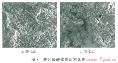 實(shí)驗(yàn)結(jié)果表明:經(jīng)過螯合酸酸化后巖心滲透率顯著提高,滲透率提高將近3倍,而經(jīng)過土酸酸化后巖心滲透率降低,降低幅度達(dá)50%,且使用土酸進(jìn)行酸化流動(dòng)過程中出現(xiàn)巖心脫砂現(xiàn)象,而螯合酸沒有出現(xiàn)脫砂問題,電鏡掃描結(jié)果也顯示土酸酸化后巖心的骨架結(jié)構(gòu)破壞,表面膠結(jié)強(qiáng)度降低,黏土礦物結(jié)構(gòu)遭到破壞,所以出現(xiàn)砂現(xiàn)象。通過掃描螯合酸酸化流動(dòng)前后巖心端面發(fā)現(xiàn),巖石骨架結(jié)構(gòu)未被破壞,且出現(xiàn)明顯的溶蝕孔道,從掃描電鏡看出酸化流動(dòng)后巖石的膠結(jié)情況完好,未出現(xiàn)結(jié)構(gòu)破壞現(xiàn)象。