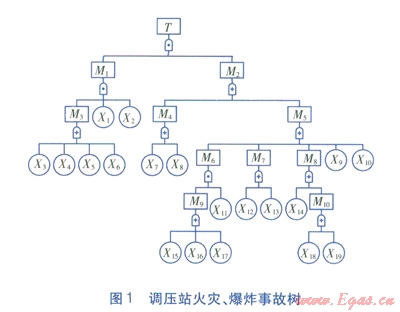 事故樹分析法作為一種工程系統(tǒng)可靠性分析與評價(jià)的有效方法,可快速、全面、形象、簡明地分析各種影響因素的相互關(guān)系,為分析調(diào)壓站火災(zāi)、爆炸事故原因提供了有效手段[2-6]。本文對事故樹分析法在調(diào)壓站事故原因分析的應(yīng)用進(jìn)行探討。