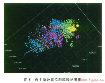 通過實時微地震監(jiān)測技術(shù)的應(yīng)用,對于完成壓裂施工、優(yōu)選射孔井段、優(yōu)化參數(shù)及提高產(chǎn)能具有很好的指導(dǎo)性[12]。本地區(qū)頁巖氣水平井壓裂微地震監(jiān)測結(jié)果表明,壓裂裂縫延伸方向受地應(yīng)力與天然裂縫雙重因素控制,已實施井微地震監(jiān)測結(jié)果表明實現(xiàn)了形成復(fù)雜裂縫網(wǎng)絡(luò)的體積壓裂目標,表明水平井分段體積壓裂工藝可滿足頁巖氣水平井改造要求(圖5)。