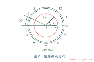 分別對垂直安裝與水平安裝的供熱管道進行測溫,截面設(shè)12個測點(見圖2),12個測點均勻分布,測點與絕熱層外表面的距離為20mm,所選擇的測溫截面的絕熱材料比較均勻。垂直與水平兩種安裝方式下的測點溫度見表1。由表1可知:對于垂直安裝供熱管道,l2個測點的平均溫度為37.18℃。對于水平安裝供熱管道,12個測點的平均溫度為37.85℃。對于兩種安裝方式,雖然測點平均溫度基本一致,但是水平安裝供熱管道測點l的溫度最高,比測點7的溫度高9.2℃,這說明水平安裝供熱管道的絕熱層熱導(dǎo)率有明顯的方向性。