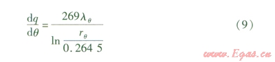 由邊界條件:當(dāng)r=0.2645m時,微元弧面溫度為270℃;當(dāng)r= rq時,微元弧面溫度為l℃,可求得式(8)在dq內(nèi)的解為:
