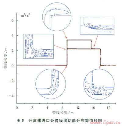 由于結構的變化,彎頭迎著來流方向的內弧面首先承受流體的沖刷,且流體速度達到最大,表明該位置的沖刷破壞危險性較高。與此同時,彎頭迎流側中上部位置形成局部湍流,湍流強度有明顯增強,湍流動能數在彎頭區(qū)域處達到最大值75m2/s2(圖5)。由于流體的慣性作用,流體沿著彎頭的弧度向前流動,正對著來流方向的彎頭外弧面上方的直管段位置,也承受了較大的沖刷作用;T形管內最大流速發(fā)生在來流支管主流區(qū)域和與主流管道垂直的支管道內遠離主流一側的區(qū)域,而與主流方向一樣的另一條支管道內的流速則相對平緩。同時,渦流程度也在垂直主管道的支管道中靠近主流的一側以及支管道與主管道銜接部位的拐角處有了較大提高,湍流動能數也達到了該管線的峰值。