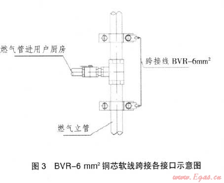 a)對(duì)于采用無(wú)縫鋼管的立管,當(dāng)立管高度不大于30m時(shí),燃?xì)饬⒐艿捻敹艘擞?/span>BVR-6mm2銅芯軟線與建筑接地裝置相連,具體做法見(jiàn)圖2。底端與燃?xì)庖牍荛y門(mén)連接處用BVR-6mm2銅芯軟線跨接,跨接電阻不大于0.03Ω。對(duì)于燃?xì)饬⒐芨叨葹?/span>30m以上的建筑,需從30m開(kāi)始,每隔不大于6m(一般為兩層)與建筑預(yù)留的防雷接地端子相連一處,做法與立管頂端的防雷接地做法相同;b)對(duì)于采用鍍鋅鋼管絲扣連接的立管,因各連接口采用聚四氟乙烯生料帶做密封材料,造成立管連接口不導(dǎo)通,各接口處須用BVR-6mm2銅芯軟線跨接,具體做法見(jiàn)圖3?,F(xiàn)有一種新型密封膠,導(dǎo)電性能良好,可作為立管絲扣連接的密封材料,現(xiàn)正在研發(fā),若能推廣應(yīng)用,各接口處就無(wú)需再做跨接了。