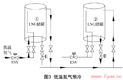 ② 低溫氮?dú)忸A(yù)冷時(shí)建議根據(jù)能量級梯使用原則,充分利用氮?dú)?,從而?jié)約液氮成本,參考工序如圖3:低溫氮?dú)鈴?號儲罐下進(jìn)液管進(jìn)、BOG氣相管出,從BOG氣相管進(jìn)2號儲罐,從2號儲罐出液閥出,最后在空溫氣化器后管道進(jìn)行放散。