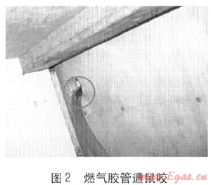 2010年11月5日,溫州市區(qū)康泰大廈一住戶廚房內(nèi)發(fā)生一起燃?xì)獗ㄊ鹿?,造?人受傷、2戶建筑受損,爆炸原因系老鼠咬破膠管引發(fā)燃?xì)庑孤?。膠管被鼠咬是用戶家中安全用氣的最大隱患之一,每年冬春兩季鼠患最為嚴(yán)重。統(tǒng)計(jì)數(shù)據(jù)顯示,2009年公司供氣區(qū)域內(nèi)發(fā)生230起有關(guān)膠管隱患處警,其中膠管被鼠咬有76起;2010年共發(fā)生有關(guān)膠管隱患處警200起,其中膠管被鼠咬有93起,進(jìn)而發(fā)生爆燃的有5起。通常用戶家里所使用的燃?xì)饽z管為橡膠軟管,易被鼠咬(見圖2),用戶在不知道的情況下開啟灶具開關(guān)就會(huì)產(chǎn)生爆炸、爆燃等事故。