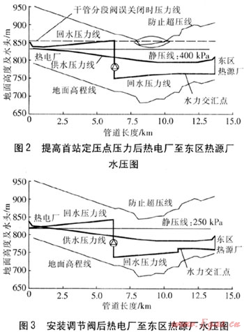 方法二:在水力交匯點(diǎn)熱電廠一側(cè)的回水管道上安裝調(diào)節(jié)閥,安裝調(diào)節(jié)閥后水壓圖見(jiàn)圖3。