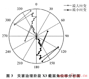 首先,管體應(yīng)力釋放要控制在合理范圍內(nèi)。一定長(zhǎng)度內(nèi)的管體應(yīng)變既然已發(fā)生,就很難再回復(fù)到初始狀態(tài);過(guò)度的釋放有可能會(huì)加劇該管段的力學(xué)損傷,甚至影響相鄰管段的穩(wěn)定和安全。換言之,管體的應(yīng)力釋放是以減緩并消弱災(zāi)害風(fēng)險(xiǎn)為目標(biāo)的,而不是像改線那樣去根除風(fēng)險(xiǎn)。治理階段的應(yīng)變動(dòng)態(tài)監(jiān)測(cè)可以控制應(yīng)力釋放的程度。其次,管體應(yīng)力的釋放要從低應(yīng)變區(qū)逐段向高應(yīng)變區(qū)迫近,而不是直接開挖管道變形最為劇烈的管段,否則有可能導(dǎo)致管體在卸載后大幅度振蕩,加劇管體損傷。隨著管溝的逐段開挖,該管段應(yīng)力分布也會(huì)發(fā)生即時(shí)變化,此時(shí)的應(yīng)變監(jiān)測(cè)數(shù)據(jù)可指導(dǎo)開挖進(jìn)度和開挖位置調(diào)整。最后,采用管道應(yīng)變監(jiān)測(cè)還可以獲得管線各監(jiān)測(cè)截面實(shí)時(shí)應(yīng)變極值的角度(如圖3),即角位移分析。角位移分析圖能夠清晰地表明最大應(yīng)力的方向、管道彎曲的方向,以及整個(gè)管段彎曲扭轉(zhuǎn)的狀態(tài)及趨勢(shì),進(jìn)而指導(dǎo)對(duì)管體進(jìn)行細(xì)微的挪移。